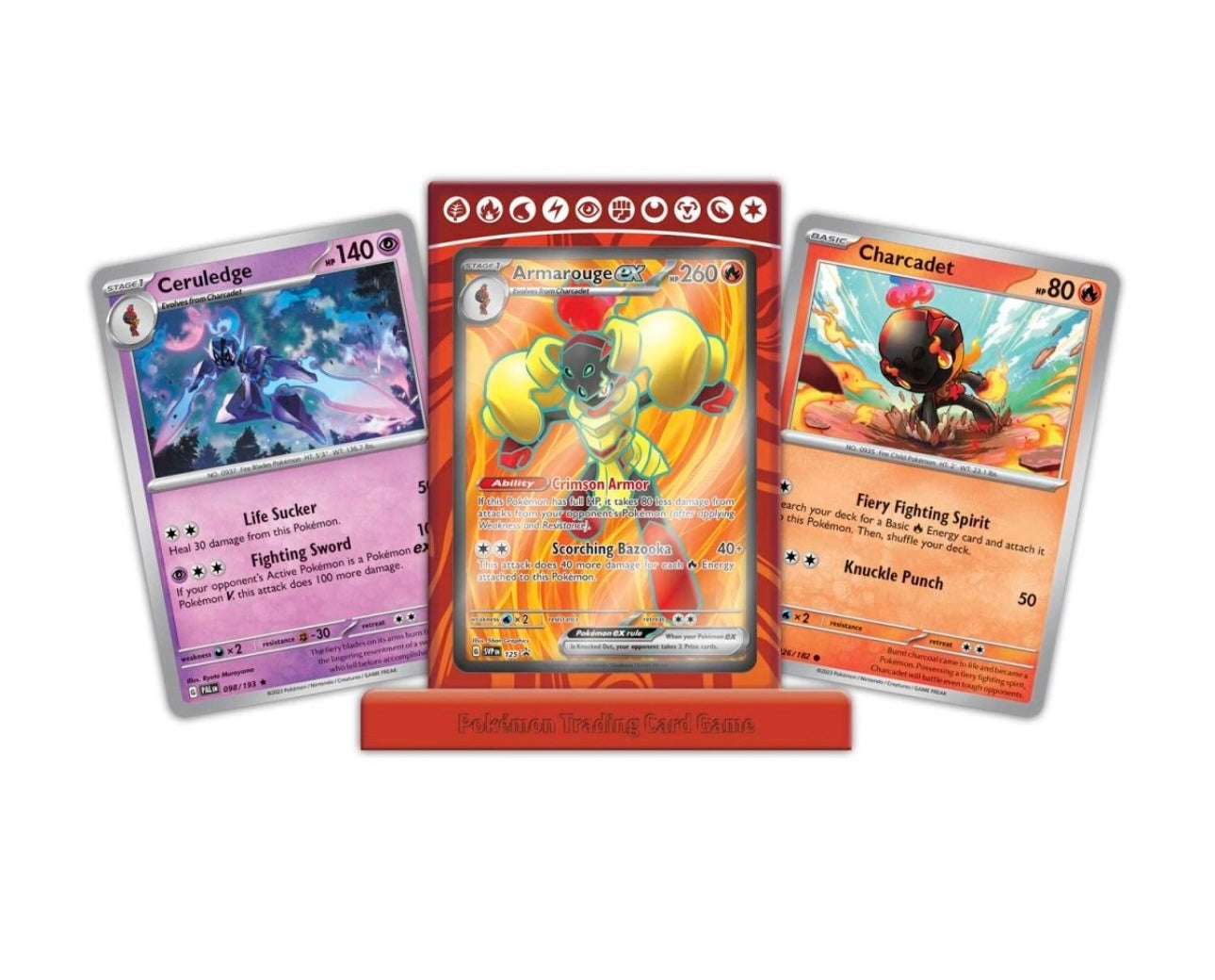 Armarouge ex’s armor is said to be the source of its incredible strength—but all those who underestimate its firepower will surely get burned! With a powerful Ability and attack, this Pokémon ex can up its defensive or offensive capabilities as it scorches its way through battles. Armarouge ex appears here as a playable etched foil promo card, and Charcadet and Ceruledge add more fuel to the inferno as foil promo cards.