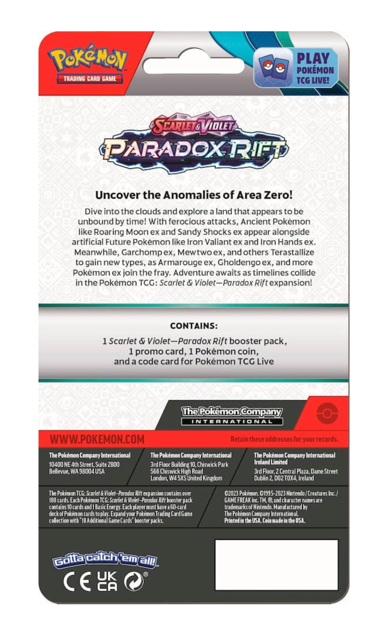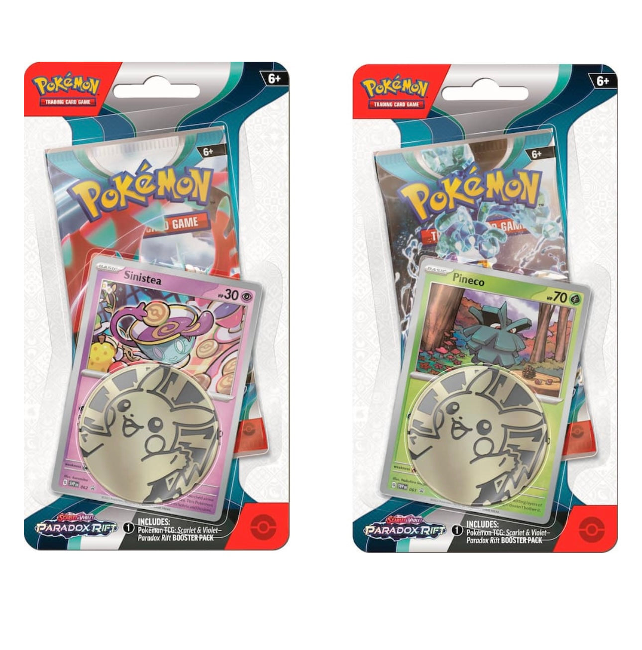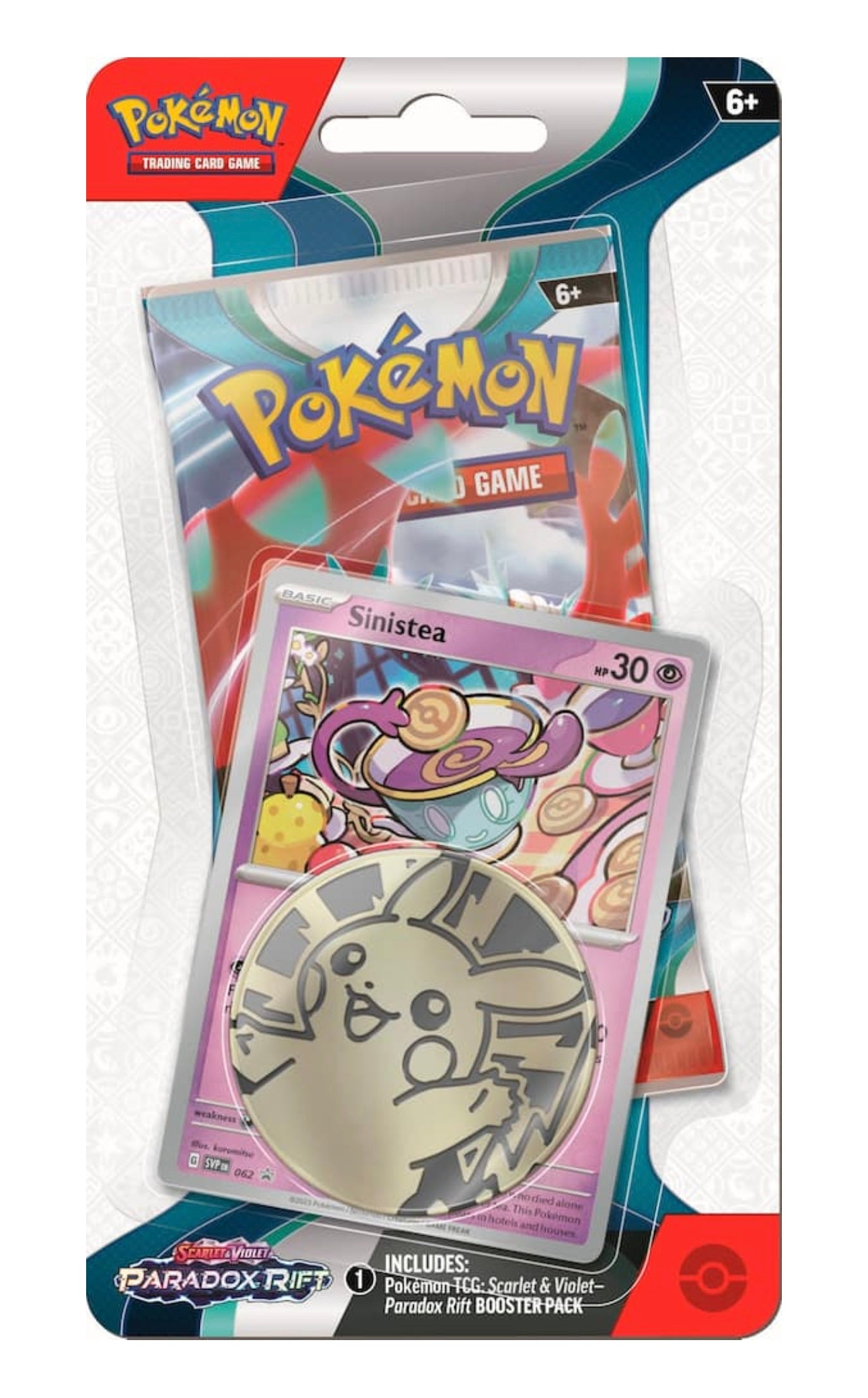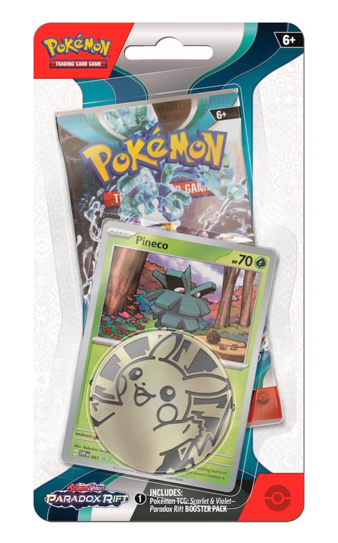 - Contains 1 Scarlet & Violet Paradox Rift booster pack, 1 promo card, 1 Pokémon coin, and a code card for Pokémon TCG Live.