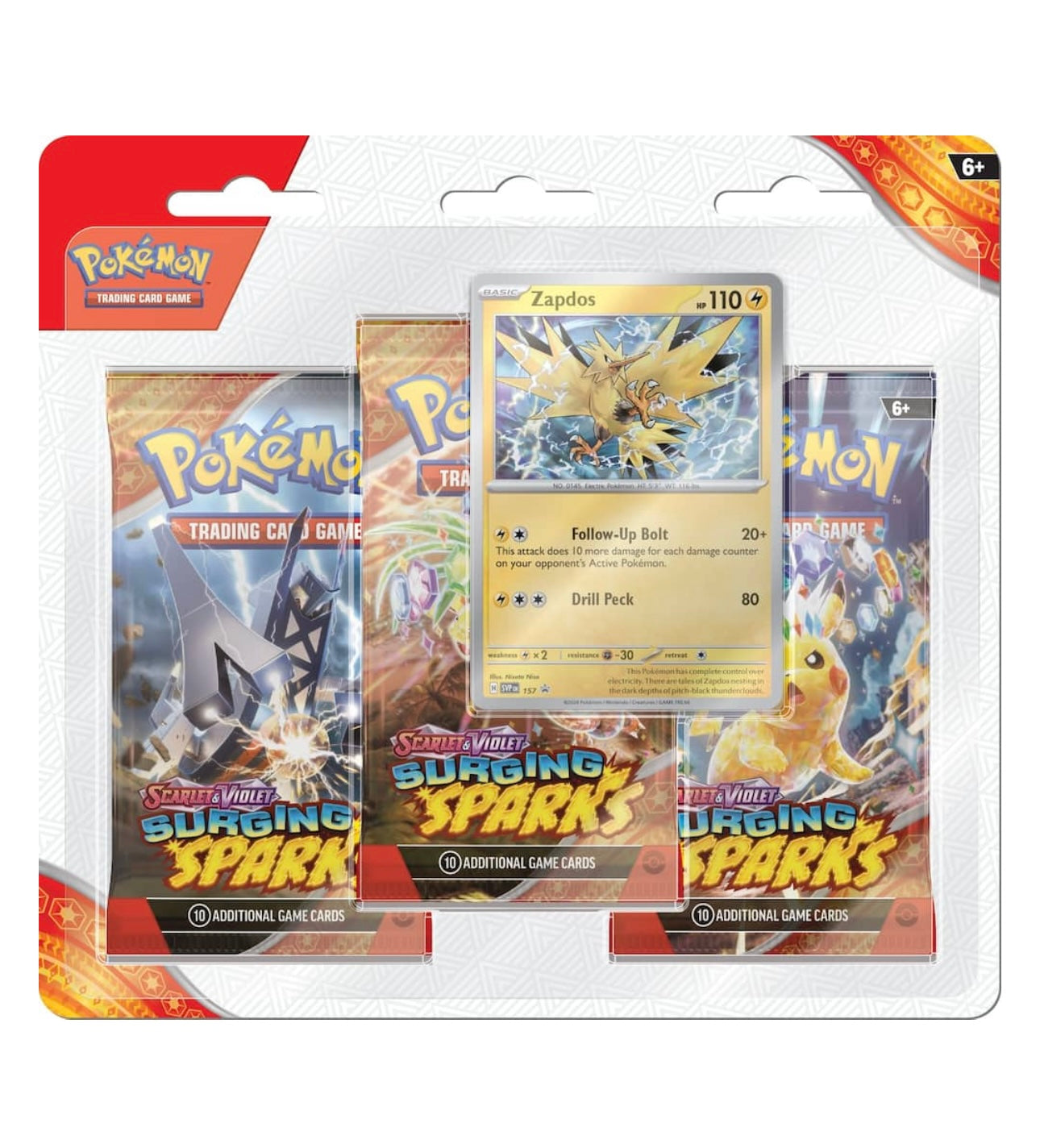 Terawatts of electricity crash down from the sky in a tropical paradise, setting the stage for the supercharged Pikachu ex! With the power of a Stellar Tera Pokémon ex, it lights up the shoreline, revealing a parade of dragon Pokémon led by the towering Alolan Exeggutor ex! Archaludon ex and Latias ex round out the horde, while new ACE SPEC cards and more new Pokémon ex bring surprises of their own. Currents crackle and dragons roar in the Pokémon TCG: Scarlet & Violet—Surging Sparks expansion!